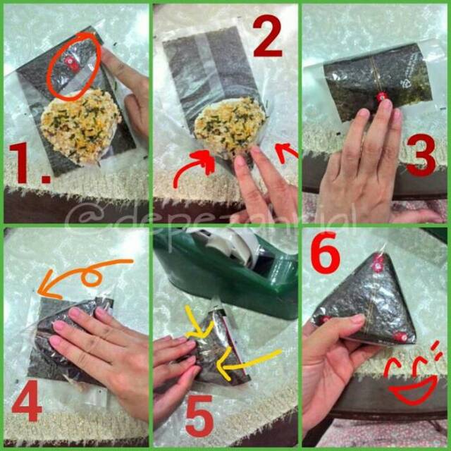 Bentuk jadi segitiga lalu tempel 1 lembar nori kecil di bagian bawahnya.